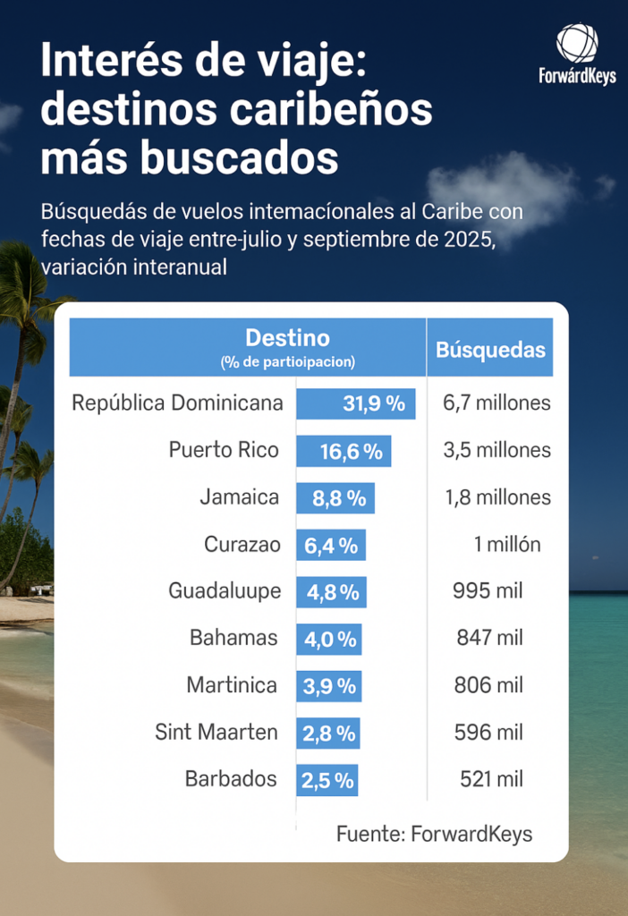 Por su parte, según la Caribbean Hotel & Tourism Association en su “Caribbean Travel Trends 2025” se destaca que la región del Caribe experimentó un “robusto alza en la intención de viaje” entre julio y septiembre de 2025, con crecimiento de búsquedas de vuelo y reservas anticipadas.