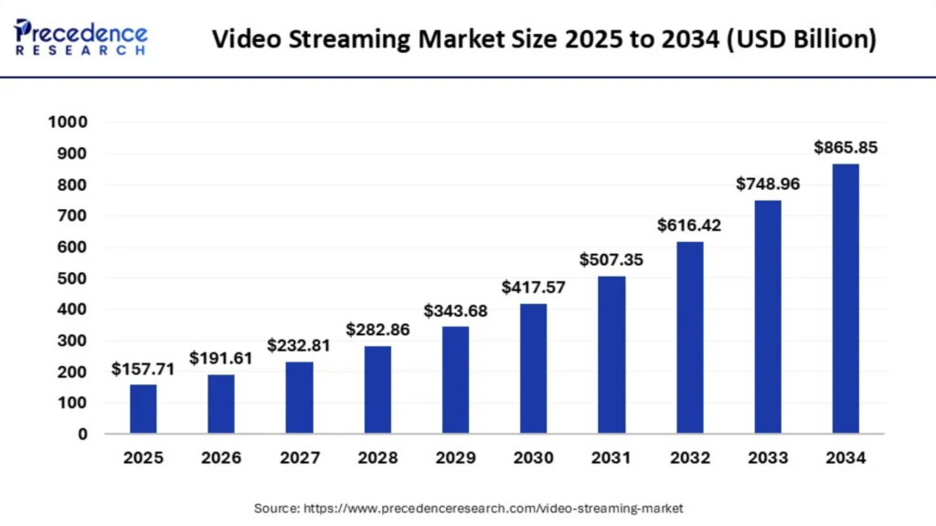 El mercado global de streaming de video alcanzó unos 157.71 mil millones de dólares en 2025 y podría llegar a 865.85 mil millones en 2034, con un crecimiento anual cercano al 20.9 %.