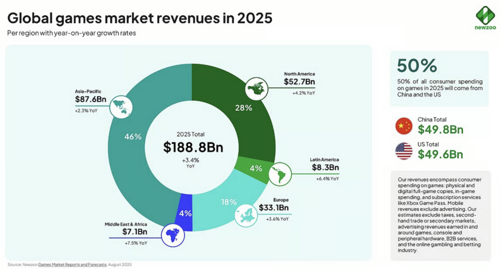 El gaming pasó de “pasatiempo de nicho” a mercado global de 188.8 mil millones de dólares en 2025, con un crecimiento del 3.4 % respecto a 2024.