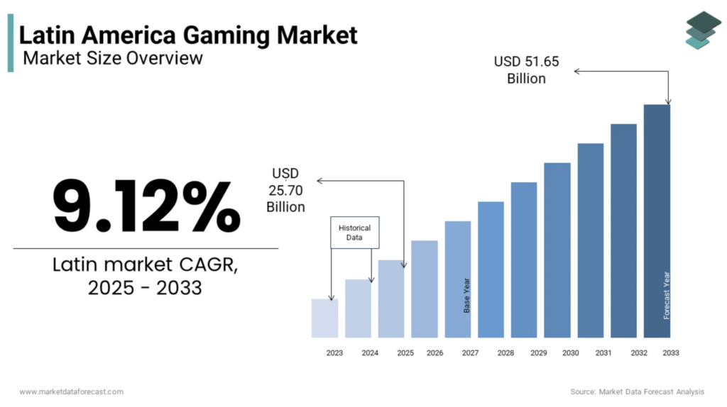 - El mercado gamer latinoamericano se valoró en 23.55 mil millones de dólares en 2024 y se espera que alcance 25.70 mil millones en 2025.